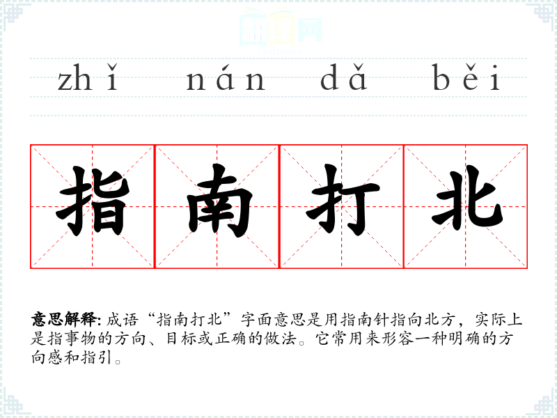 成语“指南打北”字面意思是用指南针指向北方,实际上是指事物的方向、目标或正确的做法。它常用来形容一种明确的方向感和指引。