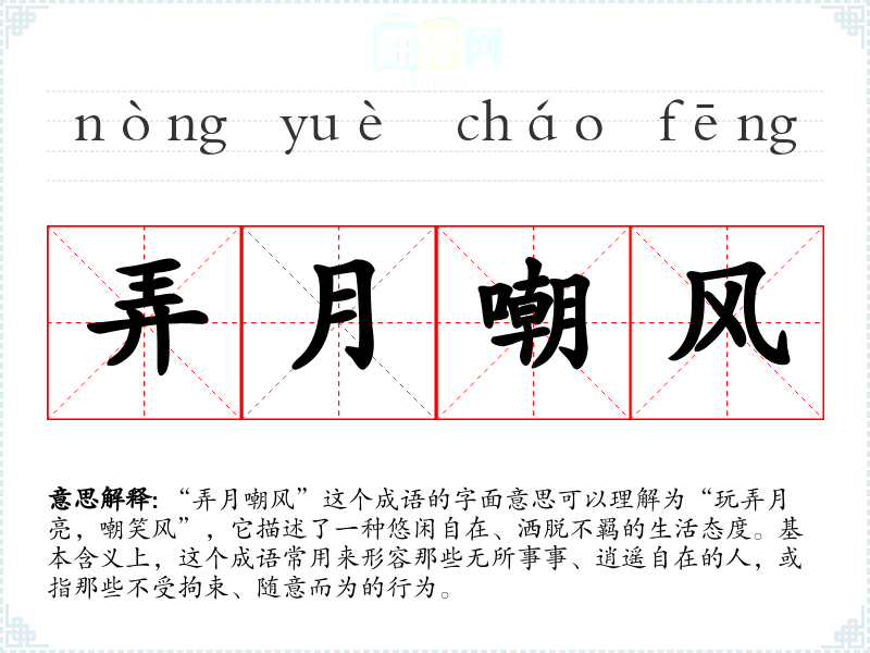 “弄月嘲风”这个成语的字面意思可以理解为“玩弄月亮,嘲笑风”,它描述了一种悠闲自在、洒脱不羁的生活态度。基本含义上,这个成语常用来形容那些无所事事、逍遥自在的人,或指那些不受拘束、随意而为的行为。