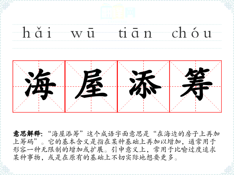 “海屋添筹”这个成语字面意思是“在海边的房子上再加上筹码”。它的基本含义是指在某种基础上再加以增加,通常用于形容一种无限制的增加或扩展。引申意义上,常用于比喻过度追求某种事物,或是在原有的基础上不切实际地想要更多。