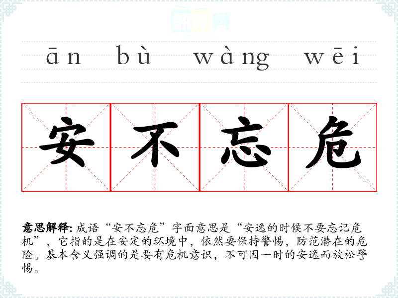 成语“安不忘危”字面意思是“安逸的时候不要忘记危机”,它指的是在安定的环境中,依然要保持警惕,防范潜在的危险。基本含义强调的是要有危机意识,不可因一时的安逸而放松警惕。