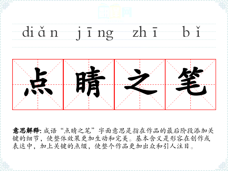 成语“点睛之笔”字面意思是指在作品的最后阶段添加关键的细节,使整体效果更加生动和完美。基本含义是形容在创作或表达中,加上关键的点缀,使整个作品更加出众和引人注目。