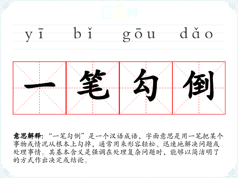 “一笔勾倒”是一个汉语成语,字面意思是用一笔把某个事物或情况从根本上勾掉,通常用来形容轻松、迅速地解决问题或处理事情。其基本含义是强调在处理复杂问题时,能够以简洁明了的方式作出决定或结论。
