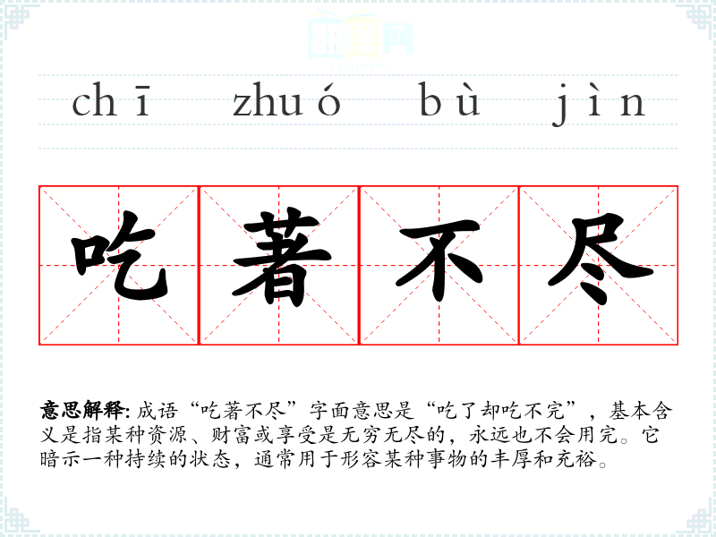成语“吃著不尽”字面意思是“吃了却吃不完”,基本含义是指某种资源、财富或享受是无穷无尽的,永远也不会用完。它暗示一种持续的状态,通常用于形容某种事物的丰厚和充裕。
