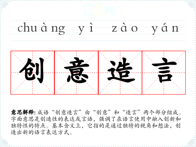 成语“创意造言”由“创意”和“造言”两个部分组成。字面意思是创造性的表达或言语,强调了在语言使用中融入创新和独特性的特点。基本含义上,它指的是通过独特的视角和想法,创造出新的语言表达方式。