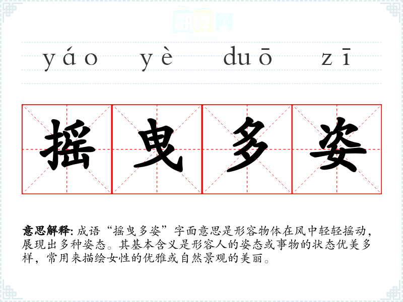 成语“摇曳多姿”字面意思是形容物体在风中轻轻摇动,展现出多种姿态。其基本含义是形容人的姿态或事物的状态优美多样,常用来描绘女性的优雅或自然景观的美丽。