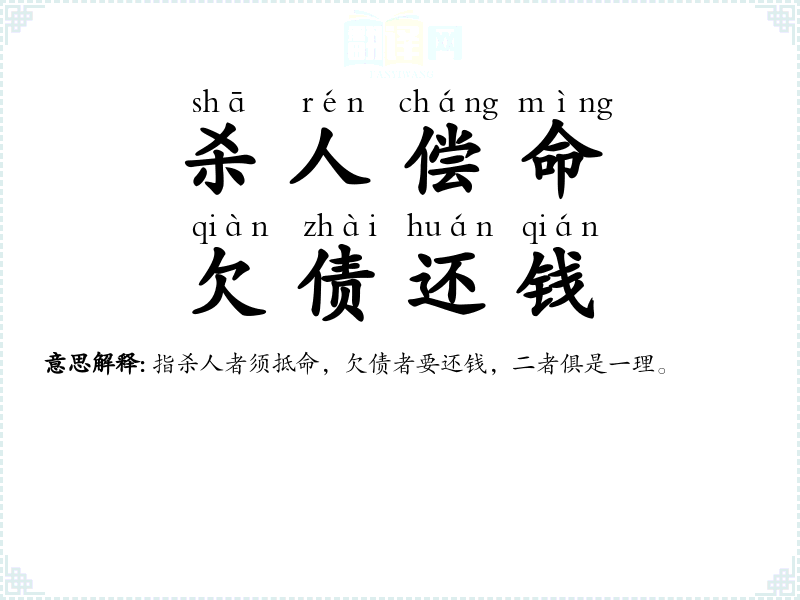 指杀人者须抵命,欠债者要还钱,二者俱是一理。 |