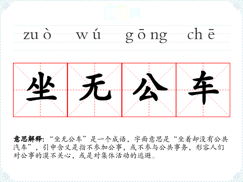 “坐无公车”是一个成语,字面意思是“坐着却没有公共汽车”,引申含义是指不参加公事,或不参与公共事务,形容人们对公事的漠不关心,或是对集体活动的逃避。