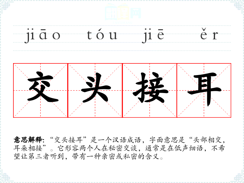 “交头接耳”是一个汉语成语,字面意思是“头部相交,耳朵相接”。它形容两个人在秘密交谈,通常是在低声细语,不希望让第三者听到,带有一种亲密或私密的含义。