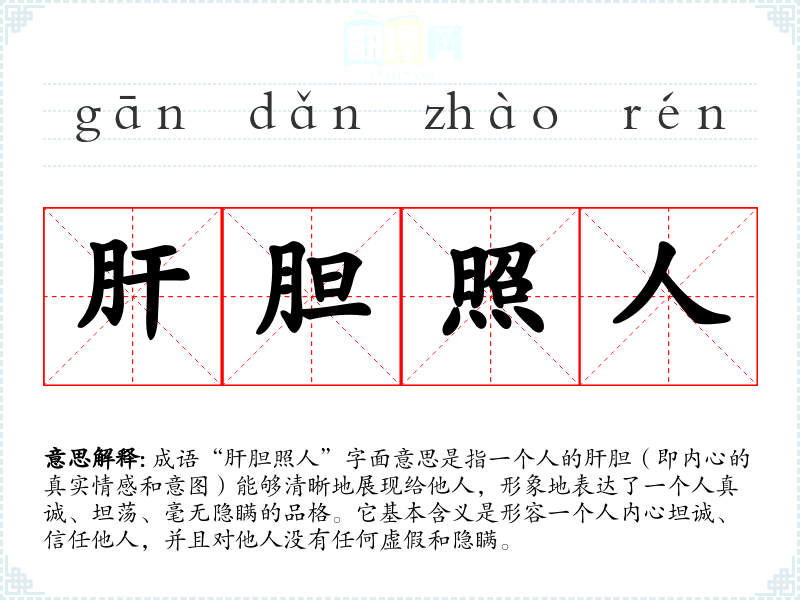 成语“肝胆照人”字面意思是指一个人的肝胆(即内心的真实情感和意图)能够清晰地展现给他人,形象地表达了一个人真诚、坦荡、毫无隐瞒的品格。它基本含义是形容一个人内心坦诚、信任他人,并且对他人没有任何虚假和隐瞒。