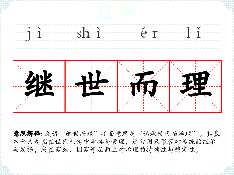 成语“继世而理”字面意思是“继承世代而治理”。其基本含义是指在世代相传中承接与管理,通常用来形容对传统的继承与发扬,或在家族、国家等层面上对治理的持续性与稳定性。