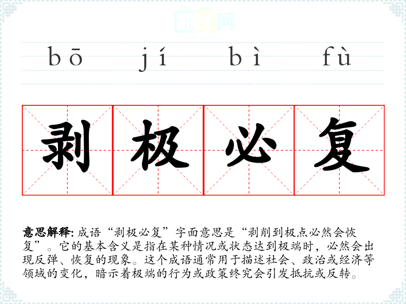 成语“剥极必复”字面意思是“剥削到极点必然会恢复”。它的基本含义是指在某种情况或状态达到极端时,必然会出现反弹、恢复的现象。这个成语通常用于描述社会、政治或经济等领域的变化,暗示着极端的行为或政策终究会引发抵抗或反转。