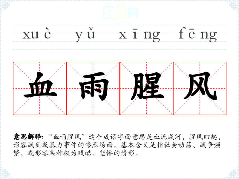 | 腥风血雨 | 风里夹着腥味,雨点带着鲜血。形容疯狂杀戮的凶险气氛或环境。 |