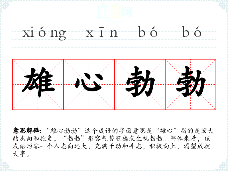 “雄心勃勃”这个成语的字面意思是“雄心”指的是宏大的志向和抱负,“勃勃”形容气势旺盛或生机勃勃。整体来看,该成语形容一个人志向远大,充满干劲和斗志,积极向上,渴望成就大事。