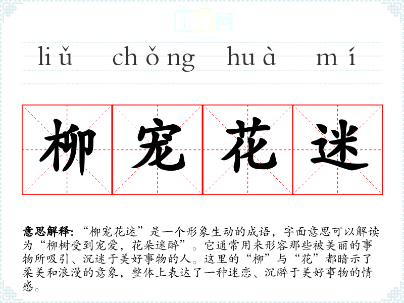 “柳宠花迷”是一个形象生动的成语,字面意思可以解读为“柳树受到宠爱,花朵迷醉”。它通常用来形容那些被美丽的事物所吸引、沉迷于美好事物的人。这里的“柳”与“花”都暗示了柔美和浪漫的意象,整体上表达了一种迷恋、沉醉于美好事物的情感。