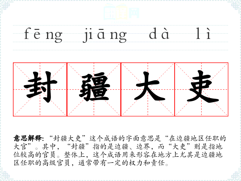 “封疆大吏”这个成语的字面意思是“在边疆地区任职的大官”。其中,“封疆”指的是边疆、边界,而“大吏”则是指地位较高的官员。整体上,这个成语用来形容在地方上尤其是边疆地区任职的高级官员,通常带有一定的权力和责任。