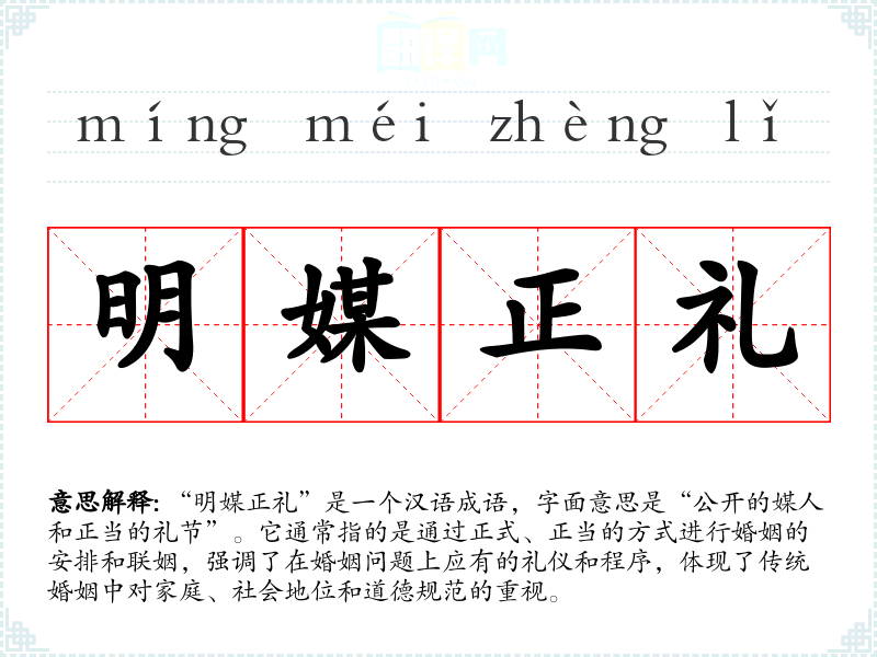 “明媒正礼”是一个汉语成语,字面意思是“公开的媒人和正当的礼节”。它通常指的是通过正式、正当的方式进行婚姻的安排和联姻,强调了在婚姻问题上应有的礼仪和程序,体现了传统婚姻中对家庭、社会地位和道德规范的重视。