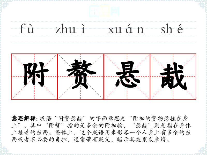 成语“附赘悬胾”的字面意思是“附加的赘物悬挂在身上”,其中“附赘”指的是多余的附加物,“悬胾”则是指在身体上挂着的东西。整体上,这个成语用来形容一个人身上有多余的东西或者不必要的负担,通常带有贬义,暗示其拖累或束缚。