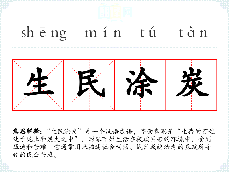 在英语中,可以用“the plight of the common people”来表达类似的意思,强调普通人的困境。不过,成语“生民涂炭”更具文化深度和历史背景,反映了**特有的社会结构与历史脉络。