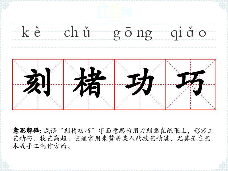成语“刻楮功巧”字面意思为用刀刻画在纸张上,形容工艺精巧、技艺高超。它通常用来赞美某人的技艺精湛,尤其是在艺术或手工制作方面。