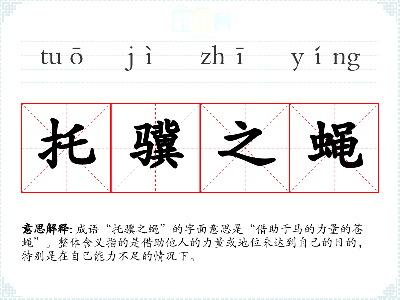 成语“托骥之蝇”的字面意思是“借助于马的力量的苍蝇”。整体含义指的是借助他人的力量或地位来达到自己的目的,特别是在自己能力不足的情况下。