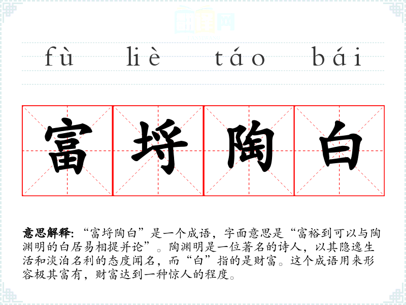 “富埒陶白”是一个成语,字面意思是“富裕到可以与陶渊明的白居易相提并论”。陶渊明是一位著名的诗人,以其隐逸生活和淡泊名利的态度闻名,而“白”指的是财富。这个成语用来形容极其富有,财富达到一种惊人的程度。