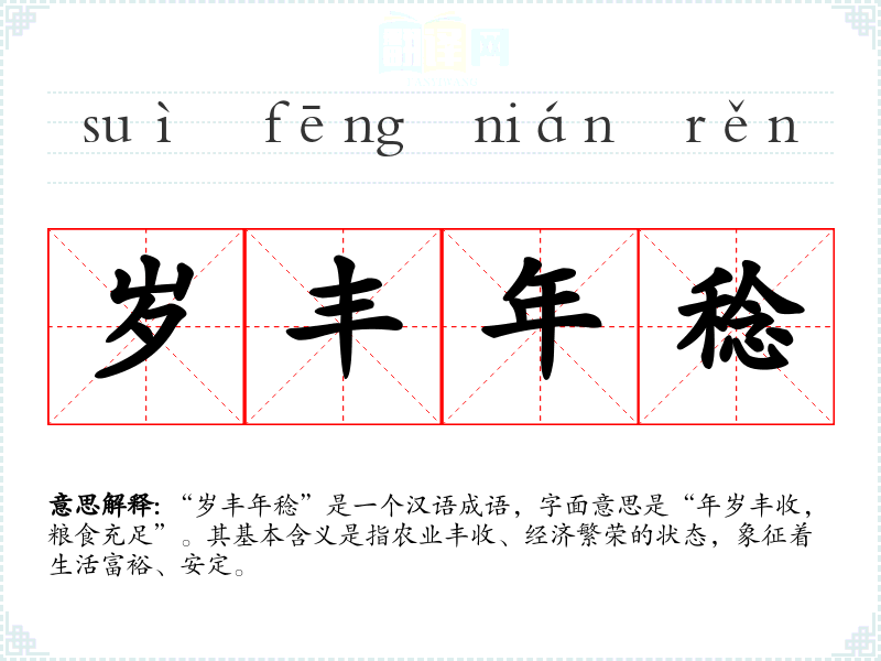 “岁丰年稔”是一个汉语成语,字面意思是“年岁丰收,粮食充足”。其基本含义是指农业丰收、经济繁荣的状态,象征着生活富裕、安定。