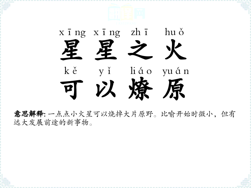 一点儿小火星可以把整个原野烧起来。常比喻新生事物开始时力量虽然很小,但有旺盛的生命力,前途无限。 |