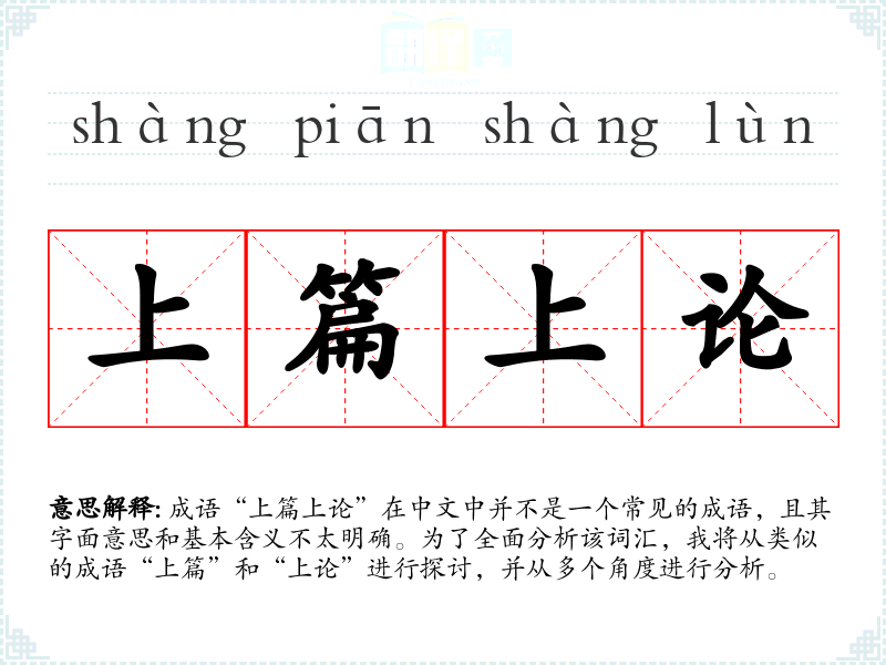 成语“上篇上论”在中文中并不是一个常见的成语,且其字面意思和基本含义不太明确。为了全面分析该词汇,我将从类似的成语“上篇”和“上论”进行探讨,并从多个角度进行分析。
