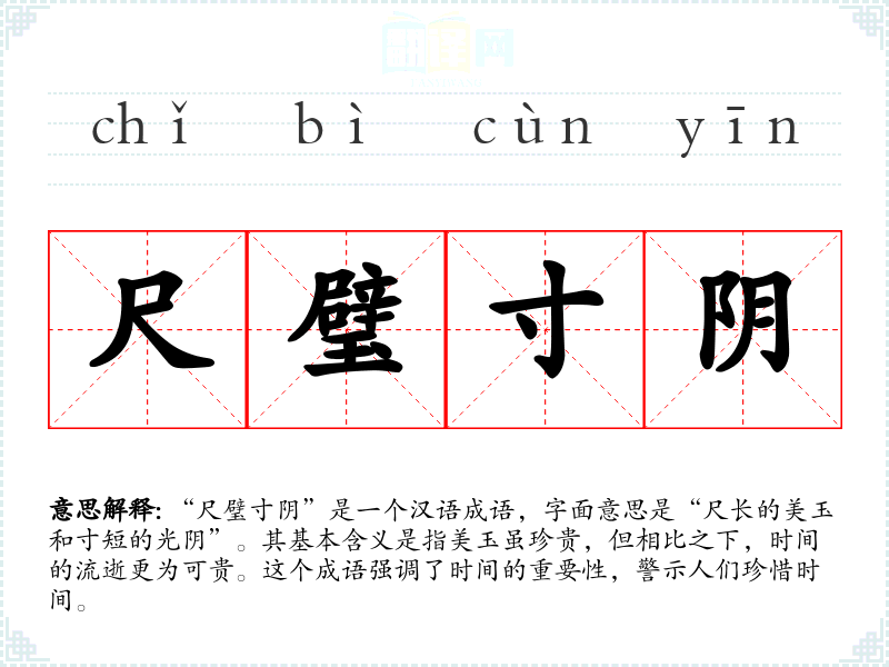 | 尺壁寸阴 | 阴:日影,光阴;寸阴:指极断的时间。日影移动一寸的时间价值比径尺的璧玉还要珍贵。极言时间可贵。 |