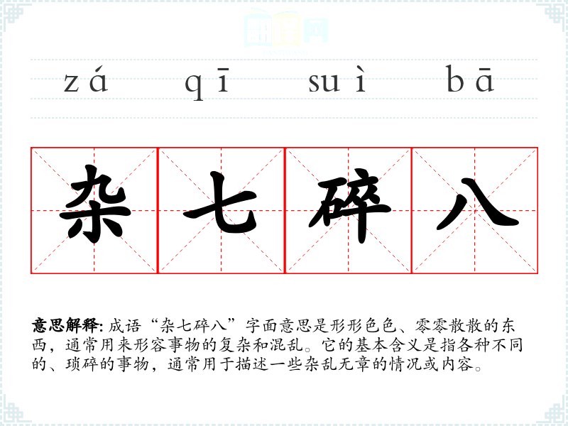 成语“杂七碎八”字面意思是形形色色、零零散散的东西,通常用来形容事物的复杂和混乱。它的基本含义是指各种不同的、琐碎的事物,通常用于描述一些杂乱无章的情况或内容。