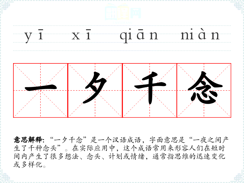 “一夕千念”这一成语的具体来源并不明确,但从字面解析来看,可以推测其可能与古代文人对于思维、灵感的描绘有关。类似的表达在古代文献中常见,用以形容灵感迸发、思维活跃的状态。