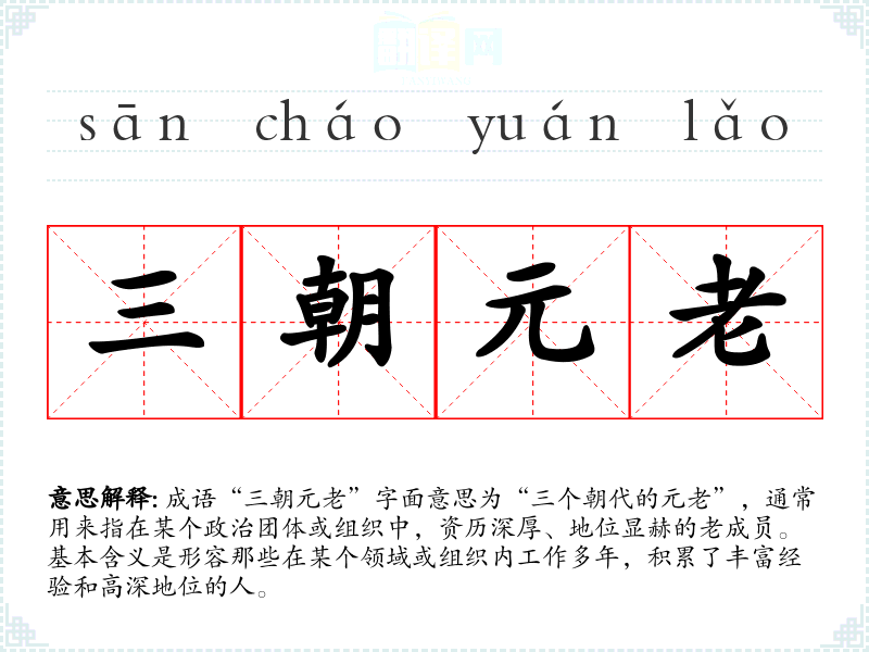 成语“三朝元老”字面意思为“三个朝代的元老”,通常用来指在某个政治团体或组织中,资历深厚、地位显赫的老成员。基本含义是形容那些在某个领域或组织内工作多年,积累了丰富经验和高深地位的人。