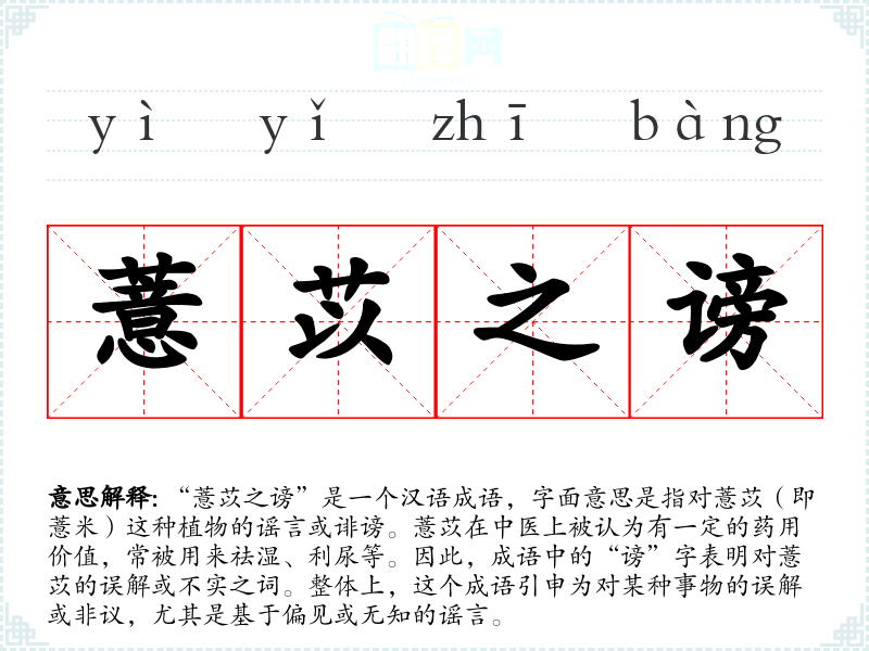 “薏苡之谤”是一个汉语成语,字面意思是指对薏苡(即薏米)这种植物的谣言或诽谤。薏苡在中医上被认为有一定的药用价值,常被用来祛湿、利尿等。因此,成语中的“谤”字表明对薏苡的误解或不实之词。整体上,这个成语引申为对某种事物的误解或非议,尤其是基于偏见或无知的谣言。