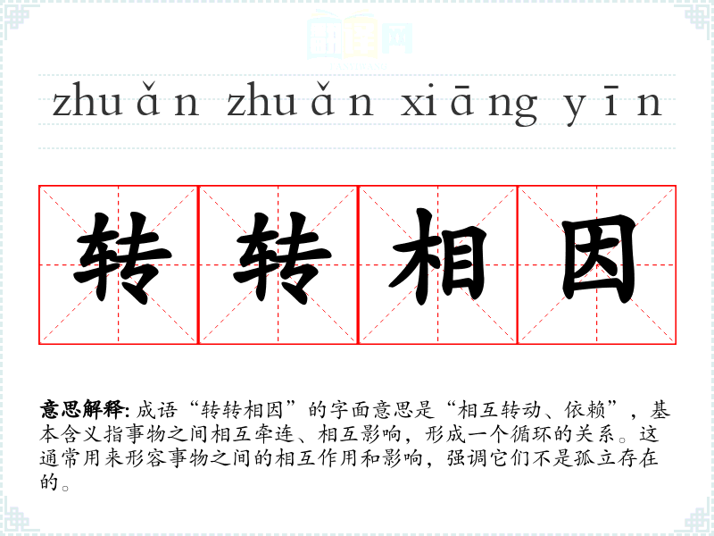 成语“转转相因”的字面意思是“相互转动、依赖”,基本含义指事物之间相互牵连、相互影响,形成一个循环的关系。这通常用来形容事物之间的相互作用和影响,强调它们不是孤立存在的。