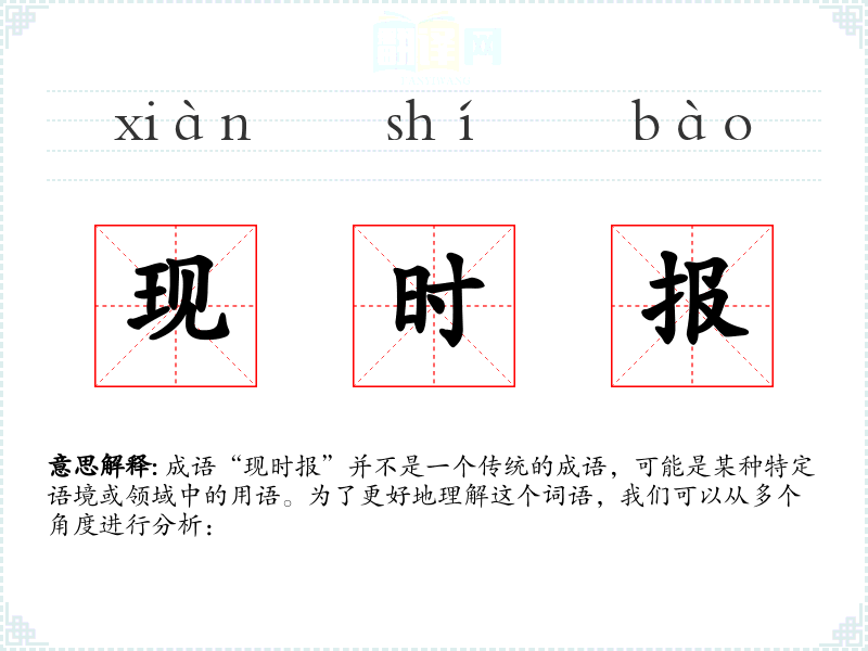 成语“现时报”并不是一个传统的成语,可能是某种特定语境或领域中的用语。为了更好地理解这个词语,我们可以从多个角度进行分析: