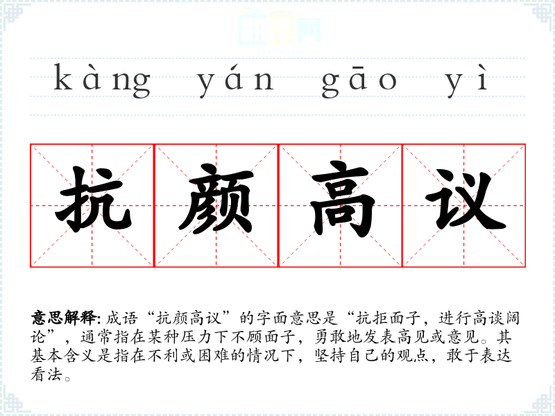 成语“抗颜高议”的字面意思是“抗拒面子,进行高谈阔论”,通常指在某种压力下不顾面子,勇敢地发表高见或意见。其基本含义是指在不利或困难的情况下,坚持自己的观点,敢于表达看法。