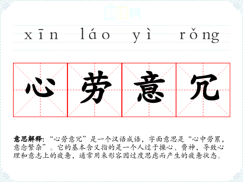 “心劳意冗”是一个汉语成语,字面意思是“心中劳累,意念繁杂”。它的基本含义指的是一个人过于操心、费神,导致心理和意志上的疲惫,通常用来形容因过度思虑而产生的疲惫状态。