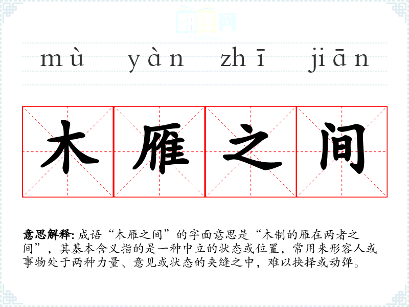 成语“木雁之间”的字面意思是“木制的雁在两者之间”,其基本含义指的是一种中立的状态或位置,常用来形容人或事物处于两种力量、意见或状态的夹缝之中,难以抉择或动弹。