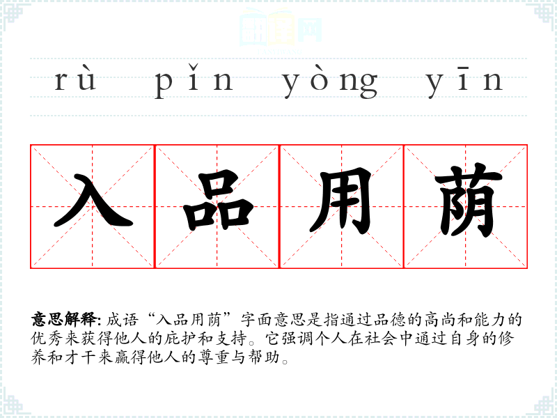 成语“入品用荫”字面意思是指通过品德的高尚和能力的优秀来获得他人的庇护和支持。它强调个人在社会中通过自身的修养和才干来赢得他人的尊重与帮助。
