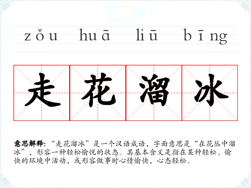 “走花溜冰”是一个汉语成语,字面意思是“在花丛中溜冰”,形容一种轻松愉悦的状态。其基本含义是指在某种轻松、愉快的环境中活动,或形容做事时心情愉快,心态轻松。