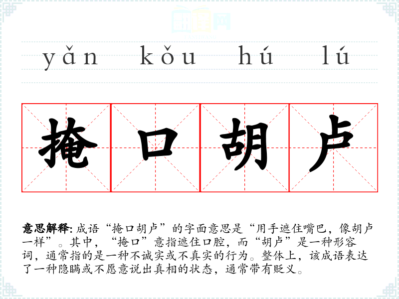 成语“掩口胡卢”的字面意思是“用手遮住嘴巴,像胡卢一样”。其中,“掩口”意指遮住口腔,而“胡卢”是一种形容词,通常指的是一种不诚实或不真实的行为。整体上,该成语表达了一种隐瞒或不愿意说出真相的状态,通常带有贬义。