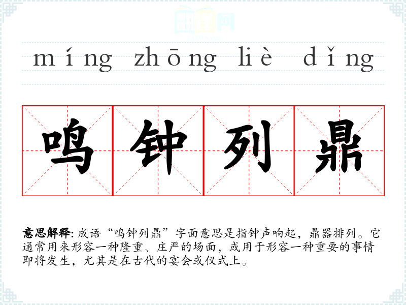 成语“鸣钟列鼎”字面意思是指钟声响起,鼎器排列。它通常用来形容一种隆重、庄严的场面,或用于形容一种重要的事情即将发生,尤其是在古代的宴会或仪式上。