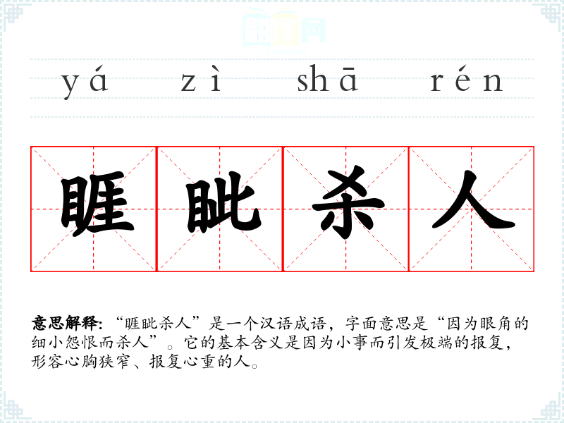 | 眦睚杀人 | 眦:眼角;睚:眼眶。因为别人瞪眼就杀了他。形容为人狭窄骄横 |