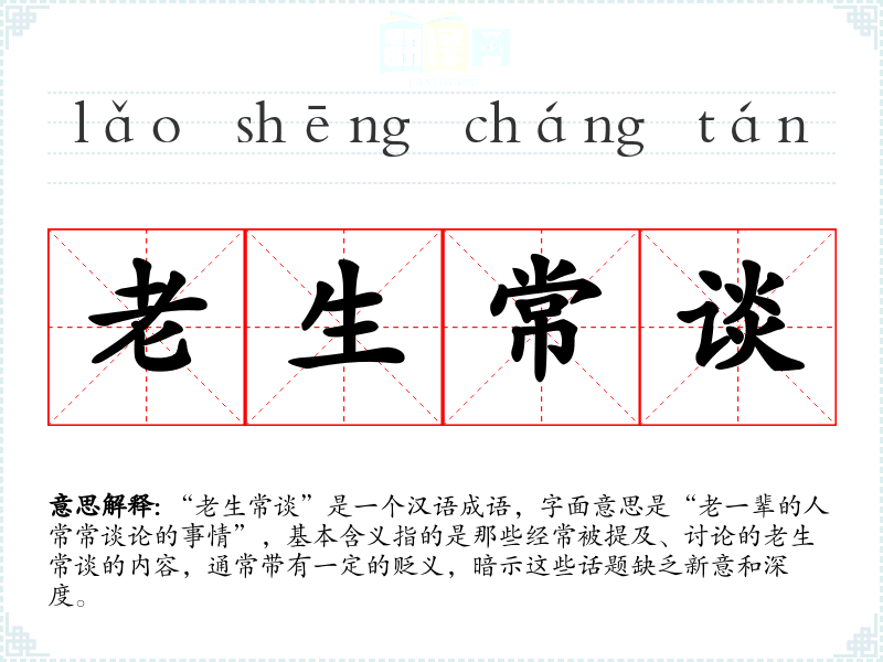 “老生常谈”是一个汉语成语,字面意思是“老一辈的人常常谈论的事情”,基本含义指的是那些经常被提及、讨论的老生常谈的内容,通常带有一定的贬义,暗示这些话题缺乏新意和深度。