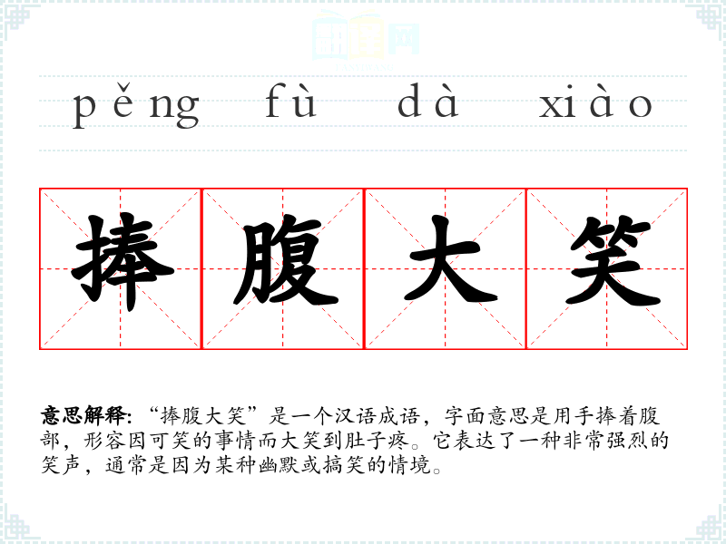 “捧腹大笑”是一个汉语成语,字面意思是用手捧着腹部,形容因可笑的事情而大笑到肚子疼。它表达了一种非常强烈的笑声,通常是因为某种幽默或搞笑的情境。