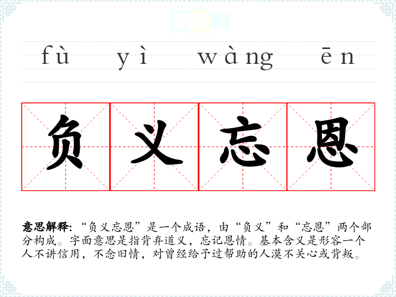 “负义忘恩”是一个成语,由“负义”和“忘恩”两个部分构成。字面意思是指背弃道义,忘记恩情。基本含义是形容一个人不讲信用,不念旧情,对曾经给予过帮助的人漠不关心或背叛。