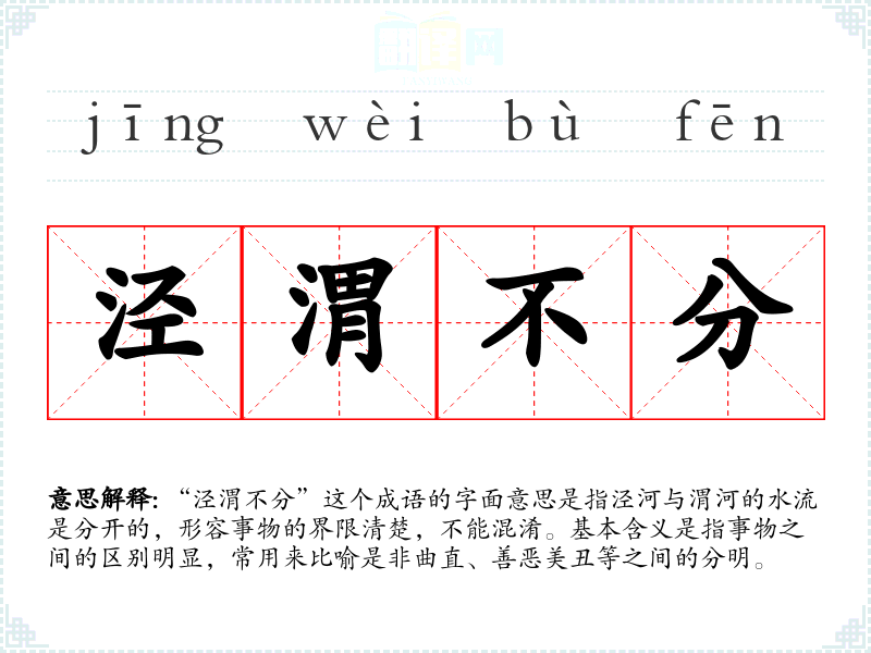 “泾渭不分”这个成语的字面意思是指泾河与渭河的水流是分开的,形容事物的界限清楚,不能混淆。基本含义是指事物之间的区别明显,常用来比喻是非曲直、善恶美丑等之间的分明。