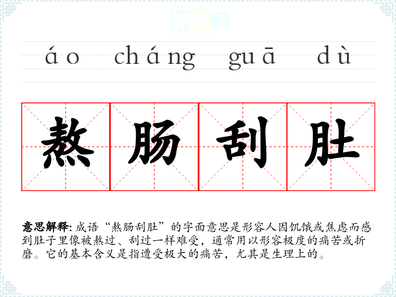 成语“熬肠刮肚”的字面意思是形容人因饥饿或焦虑而感到肚子里像被熬过、刮过一样难受,通常用以形容极度的痛苦或折磨。它的基本含义是指遭受极大的痛苦,尤其是生理上的。