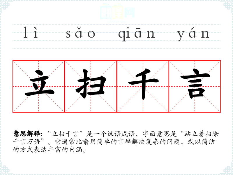 “立扫千言”是一个汉语成语,字面意思是“站立着扫除千言万语”。它通常比喻用简单的言辞解决复杂的问题,或以简洁的方式表达丰富的内涵。