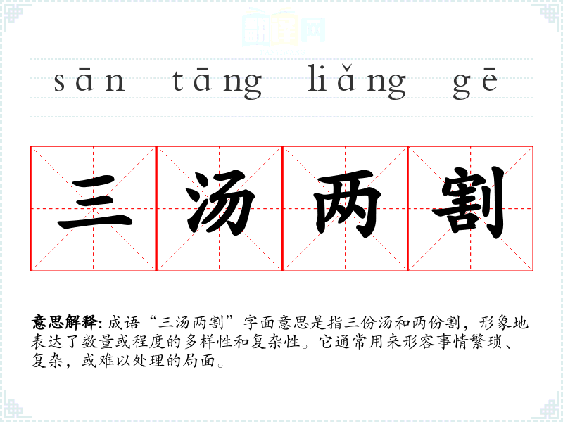 成语“三汤两割”字面意思是指三份汤和两份割,形象地表达了数量或程度的多样性和复杂性。它通常用来形容事情繁琐、复杂,或难以处理的局面。